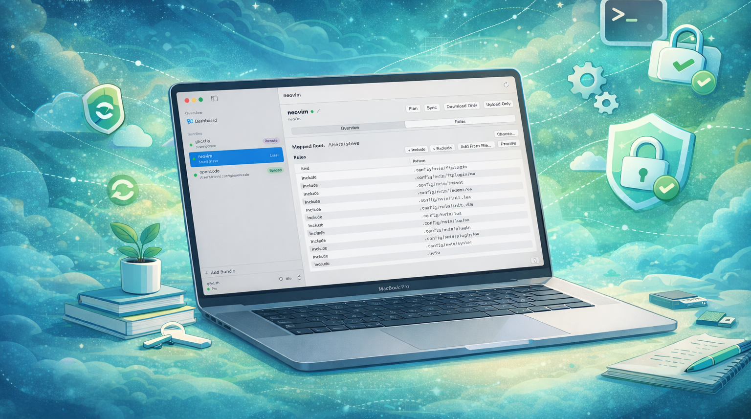 The app intelligently diffs your config files. It doesn’t just blindly overwrite things; it checks for changes and only syncs files that have actually changed across machines, keeping everything in sync without you thinking about it.